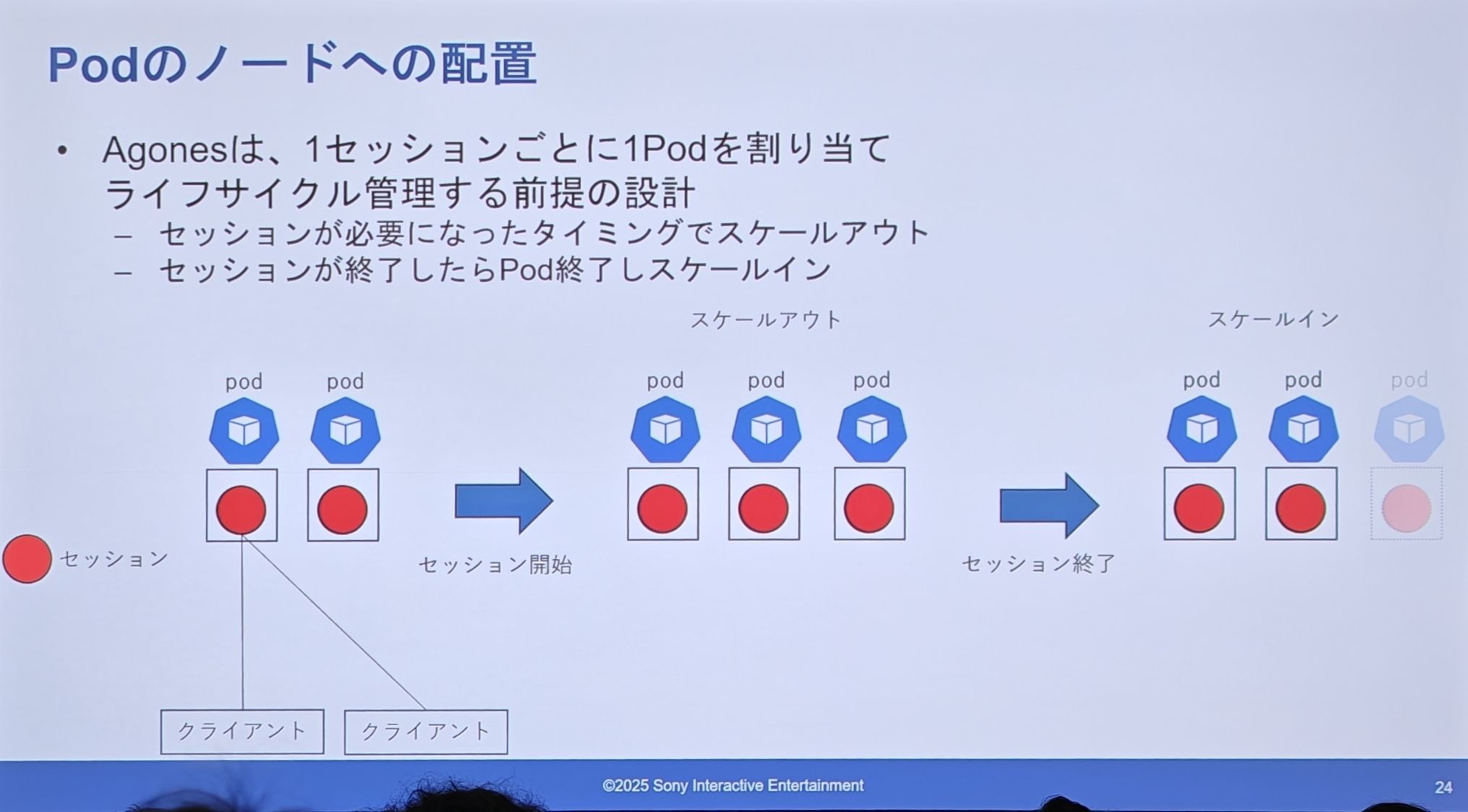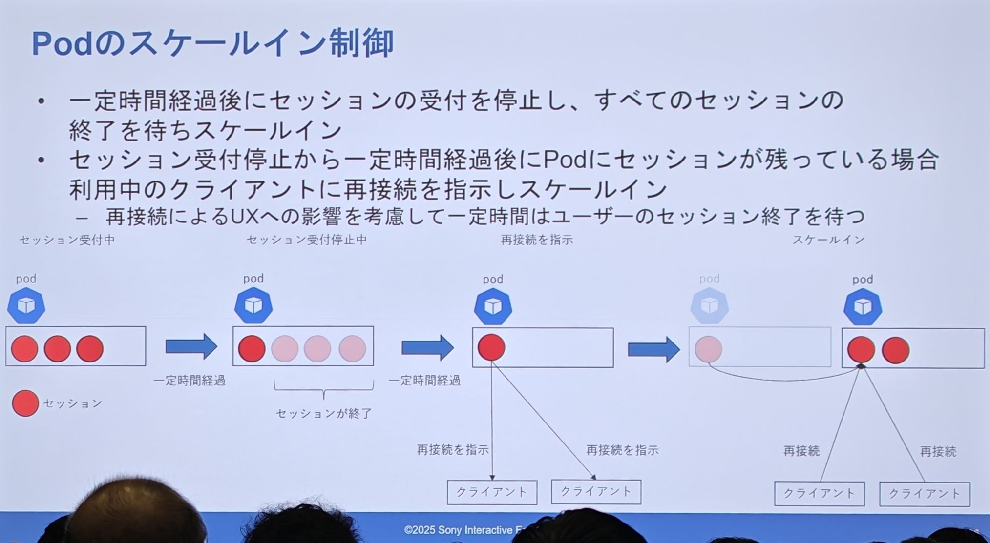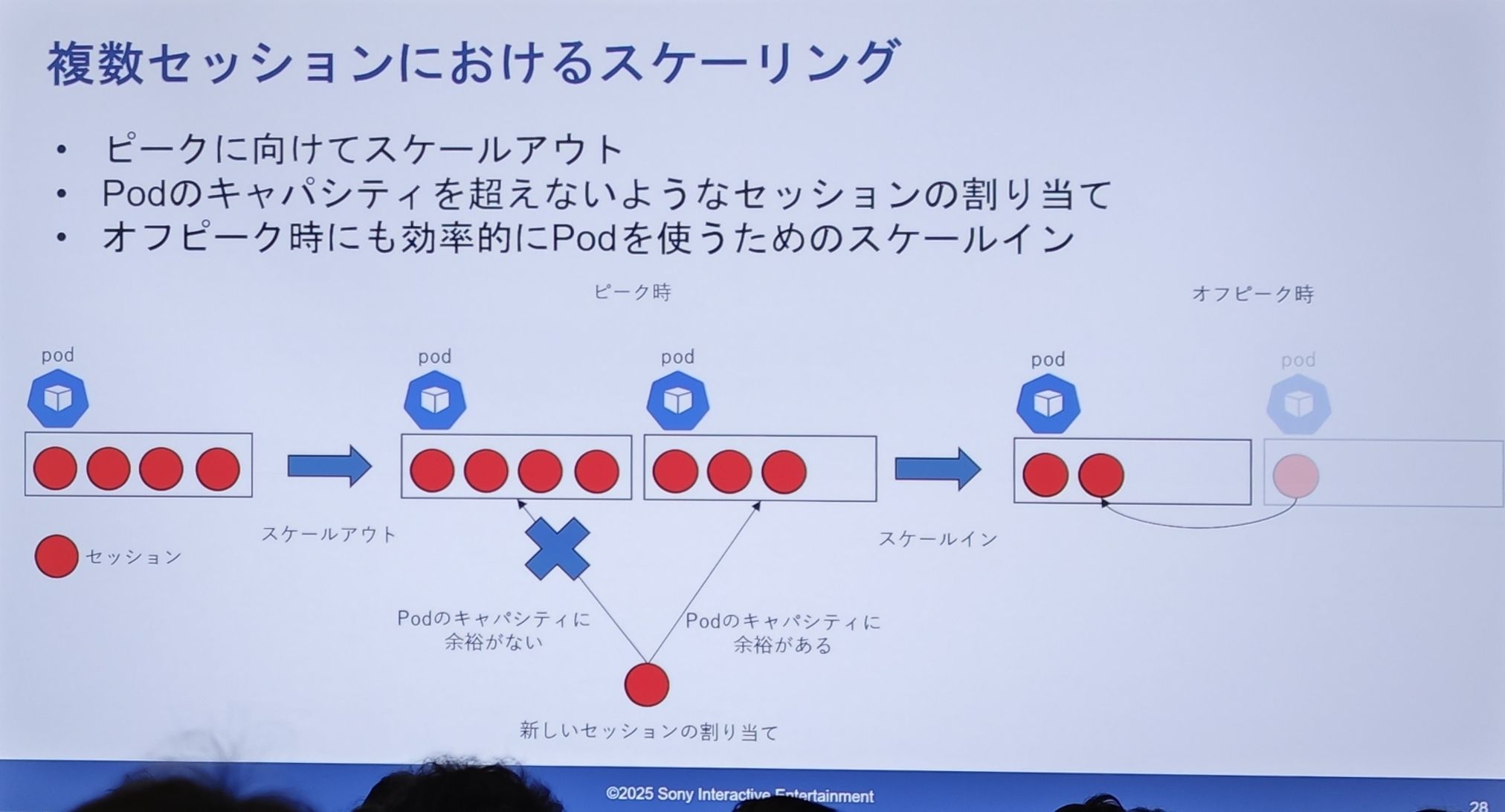 - 缩容(Scale-in):为了在非高峰期有效利用 Pod,需要进行缩容。图上展示了“会话合并”的过程:一个 Pod 上的会话可以被迁移到另一个有空位的 Pod 上,然后将完全空闲的 Pod 进行销毁。