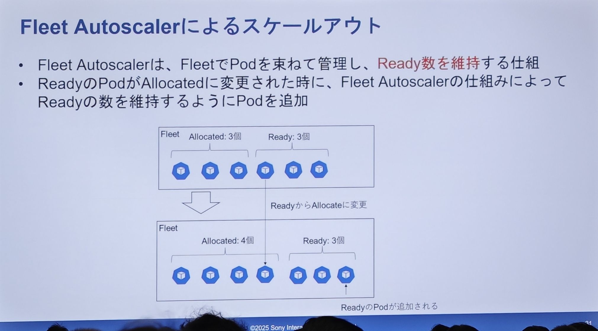Ready的 Pod 因为被分配给会话而转为Allocated状态时,Ready的 Pod 数量就会减少。 Fleet Autoscaler会立刻检测到这一点,并自动创建一个新的 Pod,以补充Ready缓冲池,使其数量维持在预设的水平。
