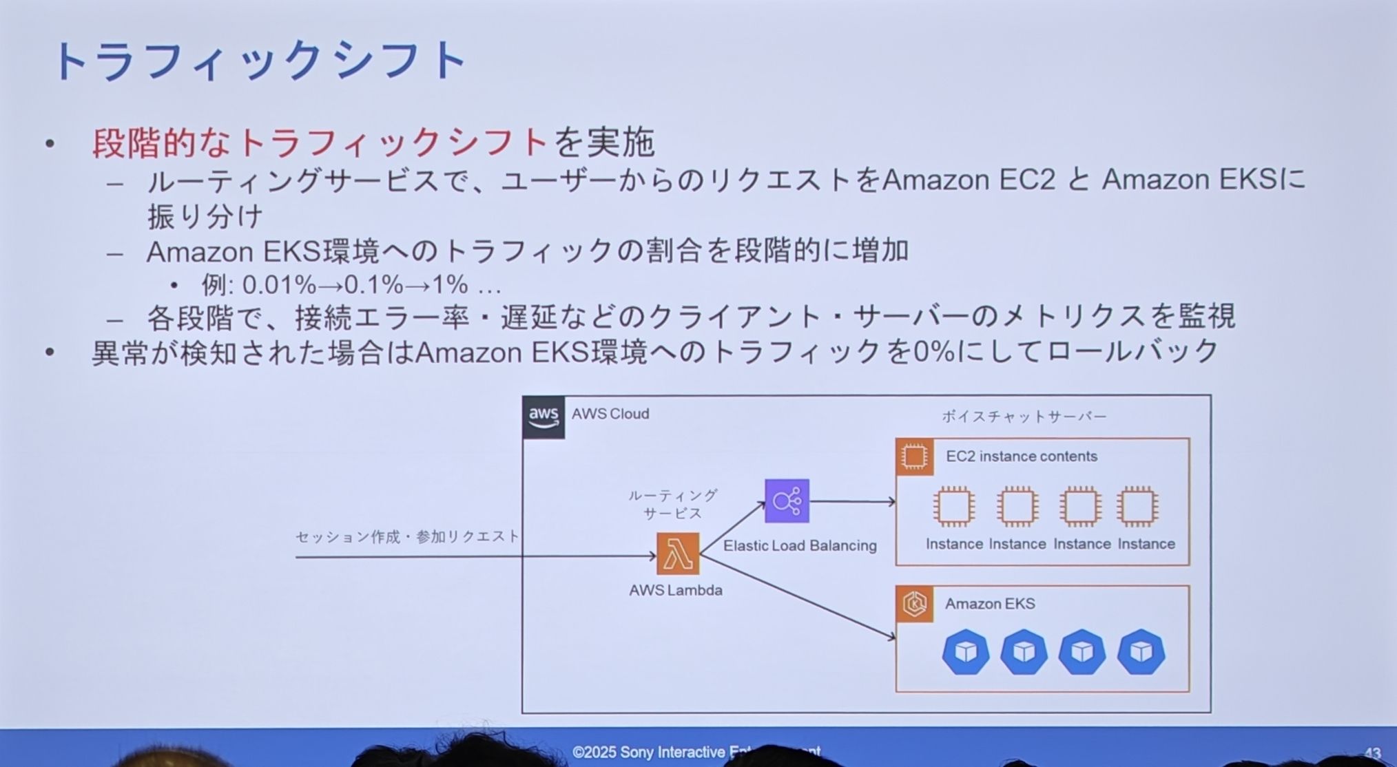 - 实施阶段性的流量切换:在路由服务(Lambda)层,将用户的请求,按比例分配到旧的 EC2 集群和新的 EKS 集群。